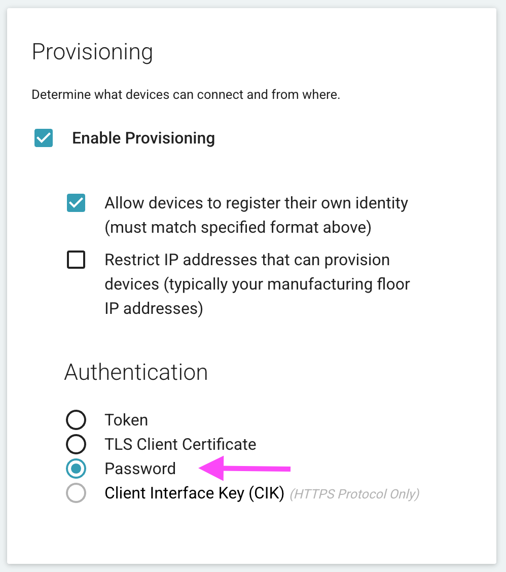 Ensure you have the IoT Connector's provisioning/authentication configuration is set to Password. You can use the previous examples, but will need to make some minor changes, as outlined below.