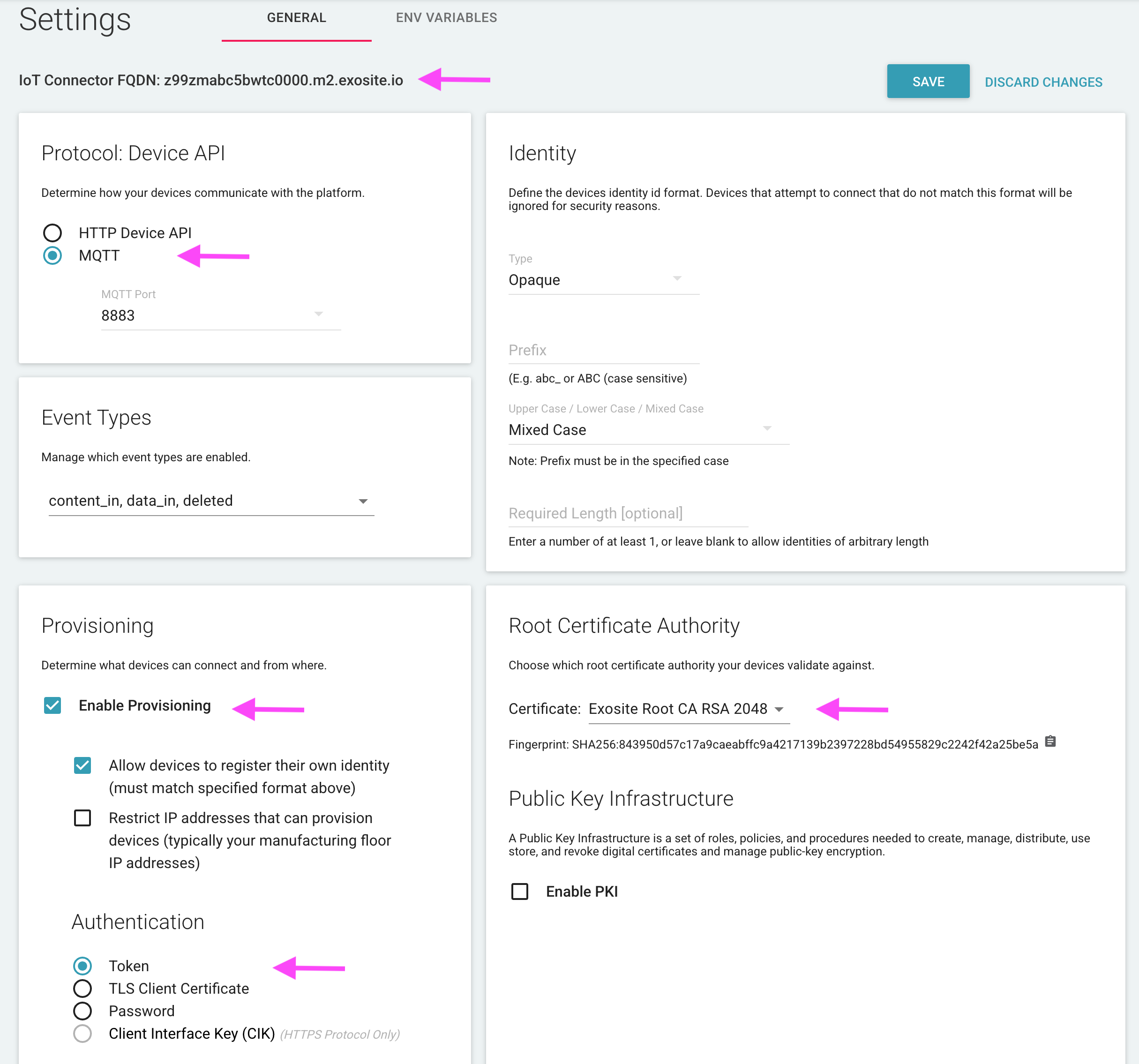 - Device ID must conform to the identity format specification defined in the Settings tab of the IoT Connector UI.