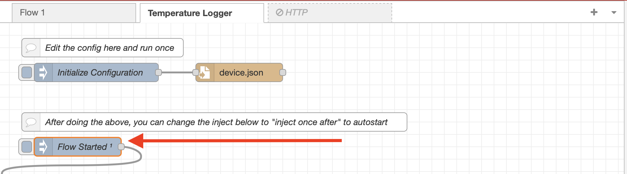 Deploy the flow and trigger the "Initialize Configuration" node to establish the connection with the temperature sensors. Once successfully configured, you should be able to trigger the "Flow Started" node to begin collecting and sending temperature data.