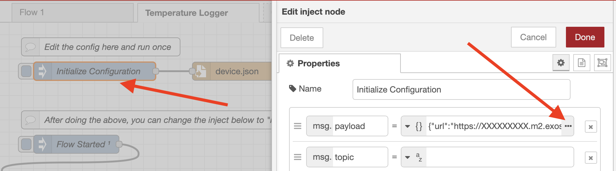 Open the imported flow and locate the "Initialize Configuration" node. Edit its JSON payload to include the IoT Connector endpoint URL you noted earlier. The payload should point to your connector's unique URL path.