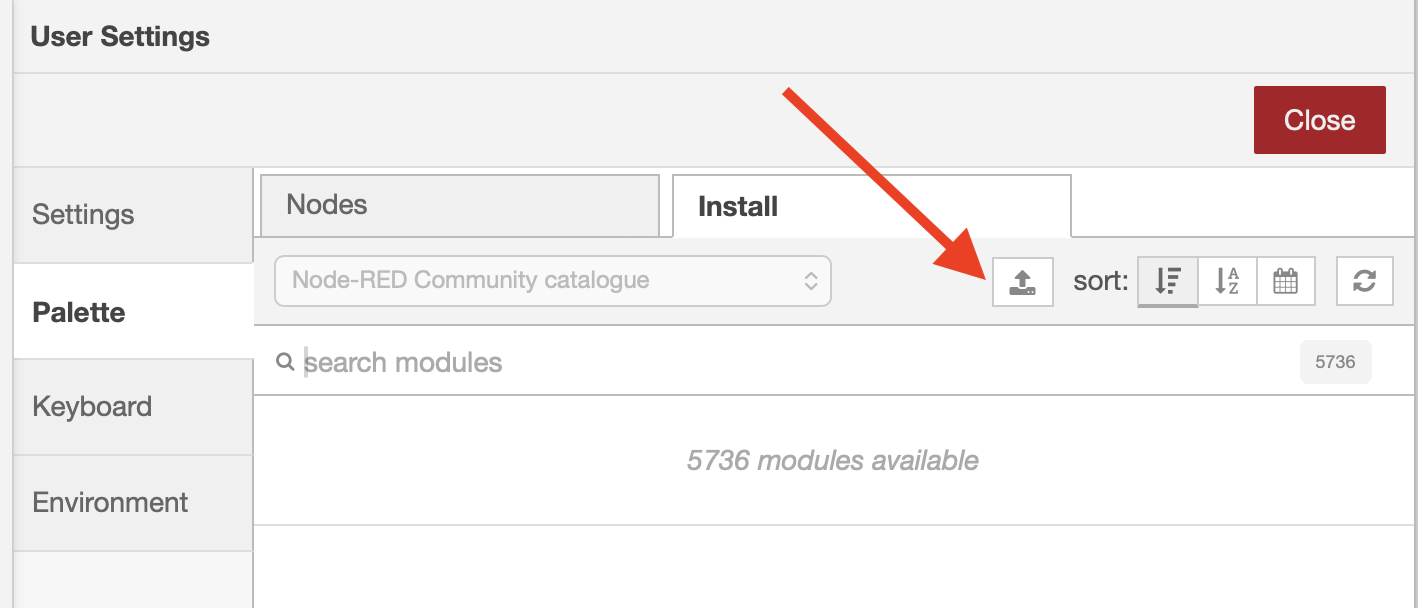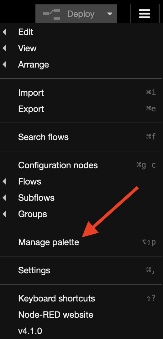 After downloading the package, you need to install it into Node-RED. Open the Node-RED editor and access the menu in the top-right corner. Select "Manage palette" to open the palette manager. For more information about the palette manager, refer to the Node-RED Palette Manager documentation.